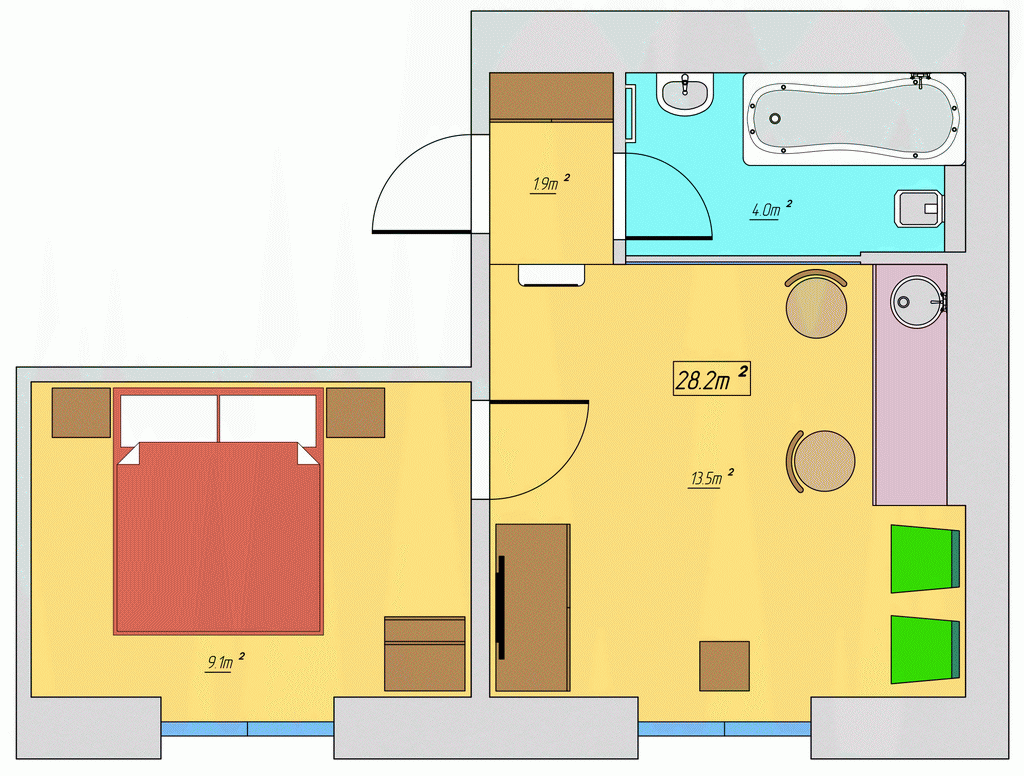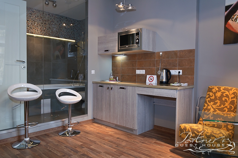 Двокімнатний готельний номер з окремою спальнею. Міні-кухня з мікрохвильовою піччю, холодильником. Ванна кімната обладнана великою ванною з гідромасажем. Вікна квартири виходять на вулицю Хрещатик. Пральна машина, праска та прасувальна дошка знаходяться у фойє. Також в наявності є дитяче ліжечко, яке доступне за попереднім запитом.